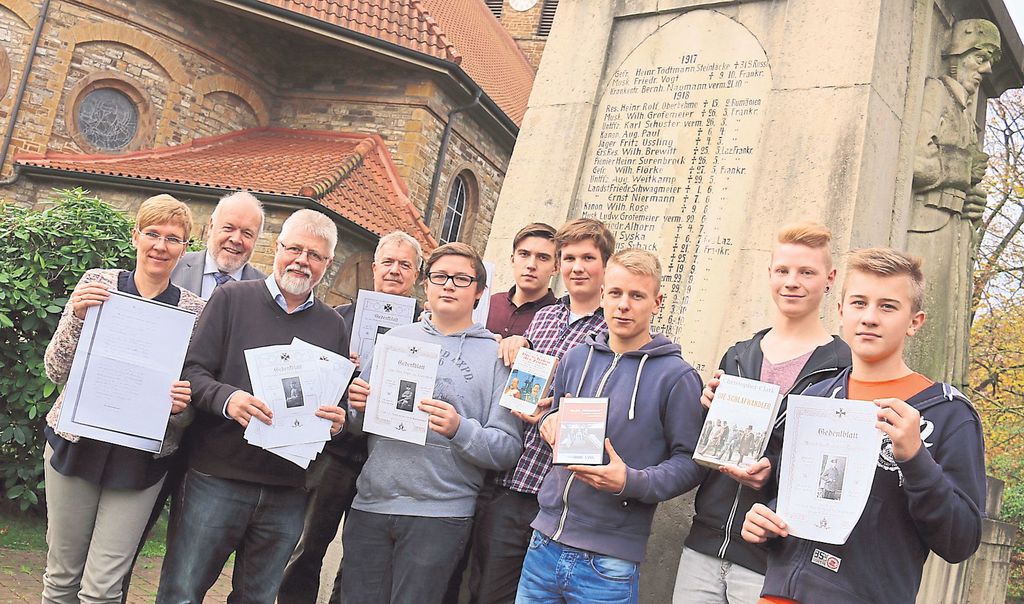 Sein Schicksal steht exemplarisch für das von vielen Kirchlengeranern, die im Ersten Weltkrieg ihr Leben ließen. Und sein Schicksal bewegt auch Schüler der Klasse 10b der Kästner-Gesamtschule. Sie beteiligen sich an einem gemeinsamen Projekt von Gesamtschule und Gemeindearchiv. Denn dort wird ein Fundus an Gedenkblättern des heimischen Kriegervereins aufbewahrt. Den Kriegerverein gibt es in dieser Form zwar nicht mehr. Aber bei den Gedenkblättern, die nach dem Ersten Weltkrieg veröffentlicht wurden, handelt es sich um wichtige Zeitzeugnisse. Das Projekt, an dem sich acht Zehntklässler, Geschichtslehrer Wolfgang Böhm und Volker Heidemann, bei der Gemeinde Kirchlengern zuständig für das Archiv, beteiligen, soll über die Auswirkungen des Ersten Weltkrieges in Kirchlengern aufklären.
