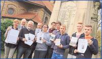 Hoffen auf Unterstützung für die Ausstellung durch die Kirchlengeraner Bevölkerung (von links): Schulleiterin Antje Stuke, Bürgermeister Rüdiger Meier, Geschichtslehrer Wolfgang Böhm, Volker Heidemann (Gemeindearchiv) und die Schüler Christoph Kaufer, Sergej Huckenheimer, Jan Burdich, Nils Rahlmeyer, Marc Mair und Felix Uschmann. Nicht auf dem Bild: die Schüler Torben Kott und Ralf Brandt. Foto: Raske