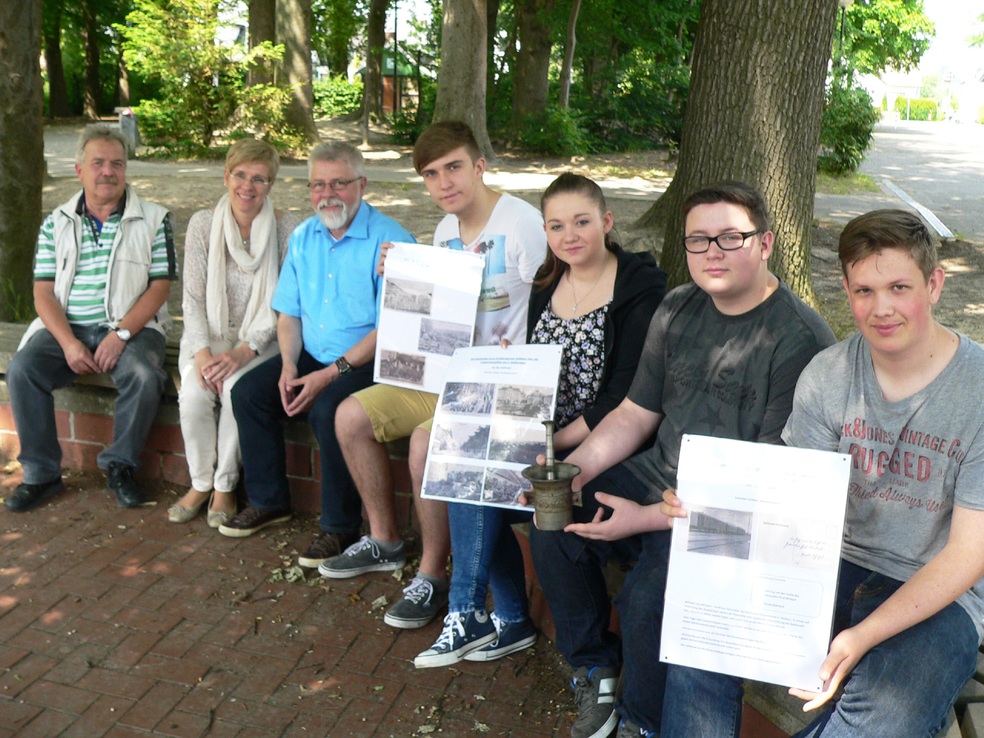Gemeindearchivar Volker Heidemann (v. l.), Schulleiterin Antje Stuke, Geschichtslehrer Wolfgang Böhm, Sergej Huckenheimer, Julia Tutschkow, Christoph Kaufer und Jan Burdich zogen gemeinsam Bilanz.