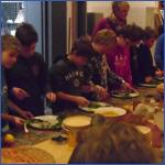 Abschließend bereiteten wir noch ein Essen mit Steinzeitwerkzeugen zu: dazu schnitten wir Petersilie mit Messern aus Stein für den Kräuterquark, kneteten Kräuterbutter und schnitten Äpfel für den Getreidebrei. Dazu gab es noch Fladenbrot und Tee. Als Besteck benutzten wir nur einen Löffel aus Holz und Schalen aus Holz als Teller. Es war sehr lecker und gemütlich!Der Tag bei den Steinzeitmenschen war viel zu kurz! Im Schneetreiben machten wir abschließend noch einen Rundgang durch die Detmolder Innenstadt – eigentlich wollten wir über einen Weihnachtsmarkt gehen. Schade! Um 14.01 Uhr kam unser Zug, in Herford mussten wir noch einmal umsteigen und um 14.45 Uhr konnten uns unsere Eltern in Kirchlengern am Bahnhof wieder abholen.