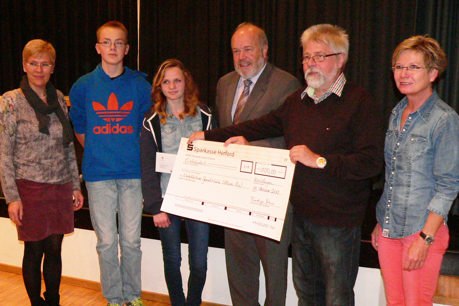 Eine besondere Ehrung nahm der Kirchlengeraner Bürgermeister Rüdiger Meier an Geldbetrag die beste Klasse einer weiterführenden Schule beim Volkslauf „Gesund beginnt im Mund“ aus Kirchlengern aus. Diesmal wurde die Klasse 8a der Erich Kästner-Gesamtschule honoriert, die mit ihrer Sportlehrerin Melanie Görge intensiv auf diesen Lauf hin trainiert hatte. Platz 2 belegte die Klasse 10a, Platz 3 die Klasse 6c. Schulleiterin Antje Stuke betonte, dass immerhin 300 Kinder aus 18 Klassen der EKG Kirchlengern dabei waren. Aber auch die Erich Kästner-Gesamtschule Kirchlengern wurde ausgezeichnet, sie erhielt den Preis für die größte, startende Gruppe aus der Hand der Orga-Team-Vertreterin Frau Schröder. Im Bild von links Schulleiterin Antje Stuke, die Klassensprecher der 8a Henrik Fischer und Luisa Hafer, Bürgermeister Rüdiger Meier, Ganztagskoordinator Wolfgang Böhm und Frau Schröder vom Orgateam.