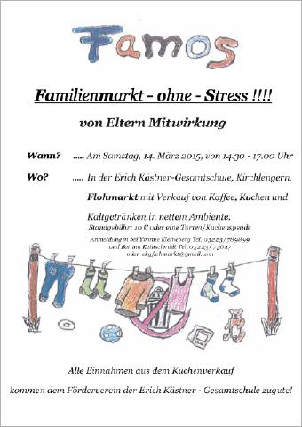 Spielzeugflohmarkt von Eltern Mitwirkung am Samstag, den 14.03.2015 von 14.30 - 17.00 Uhr in der Gesamtschule Kirchlengern mit Verkauf von Kaffee, Kuchen und Kaltgetränken. Alle Einnahmen aus dem Kuchenverkauf kommen dem Förderverein der Erich Kästner-Gesamtschule zugute.