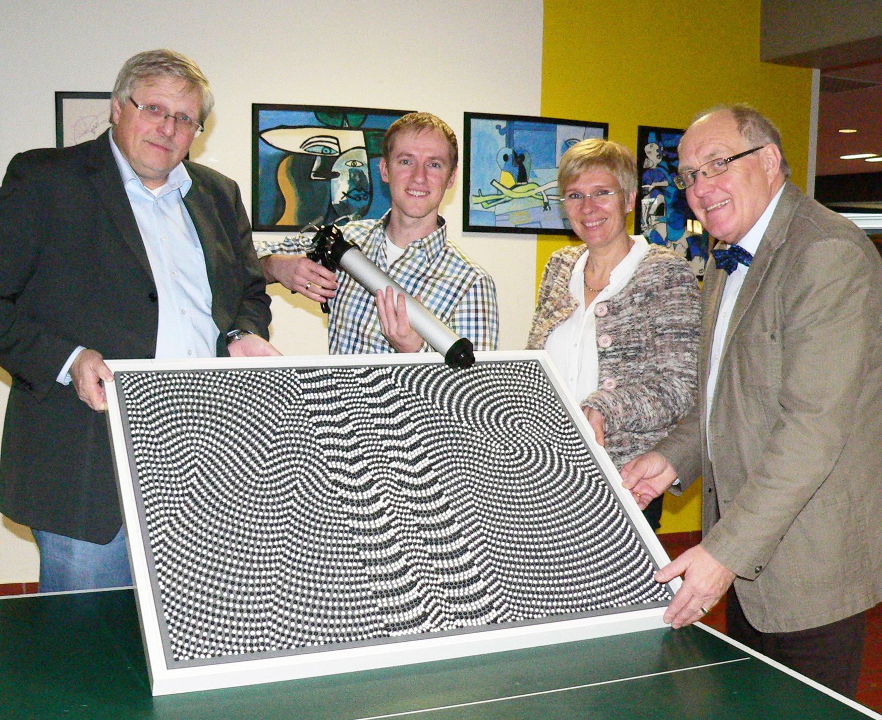 Antje Stuke, Leiterin der Erich Kästner-Gesamtschule, dort war die Idee zu der Aktion geboren worden, zeigte sich von dieser sozial und kulturell konzertierten Spenden-Aktion sofort begeistert: "Eine gute Gelegenheit für unsere Schülerinnen und Schüler, die besondere Kunst des Farbtupfens von Jakob Reh kennen zu lernen und auch aktiv an einem entsprechenden Projekt mitzuarbeiten.