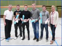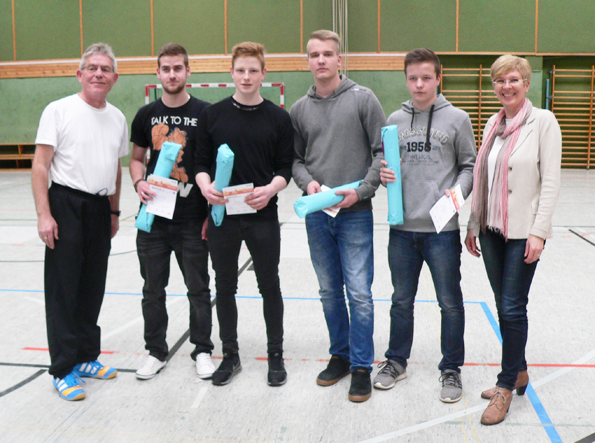 Sportlehrer und Organisator Ullrich Meis, die Schüler Robin Tödtmann, Philipp Kröger, Torben Kott, Jonathan Weichelt und Schulleiterin Antje Stuke