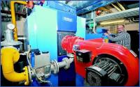 In den Eingeweiden der Gesamtschule: Klaus-Peter Ceppa, Hausmeister der Erich Kästner-Gesamtschule, stellt die Temperatur eines der beiden Heizkessel (blau) ein - die Anlage wird komplett ausgetauscht. FOTO: KARL-HENDRIK TITTEL