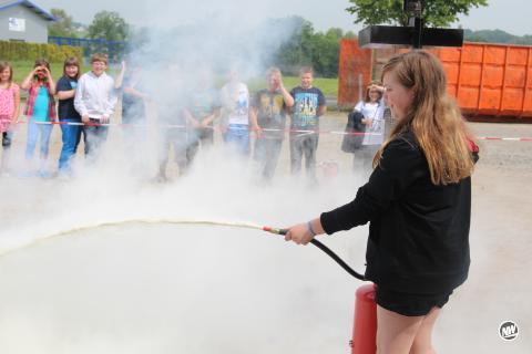Kirchlengern. Vorsichtig nähert sich Eva-Maria in Begleitung von Löschgruppenführer Michael Ober-Kassebaum den mitten auf dem Schulhof lodernden Flammen und betätigt den Feuerlöscher. Weißes Pulver schießt heraus und im Handumdrehen ist von dem Feuer nur noch eine weiße Rauchwolke übrig, die nach einigen Sekunden verfliegt.