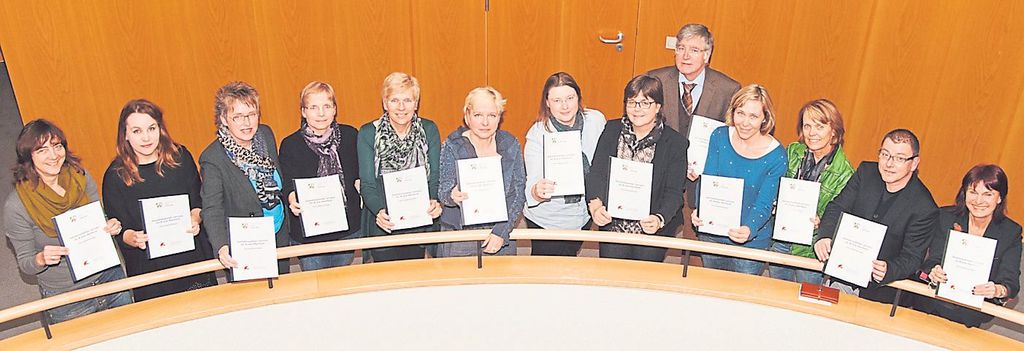 Die Schulleiterinnen der Vorreiterschulen und die Koordinatorinnen im Schulamt des Kreises, von links: Karin Staeck-Aschemeyer, Bea Koch, Bettina Wolff, Claudia Burre, Antje Stuke, Dagmar Bögeholz, Nicole Kirchhof, Heike Schmitz-Ibeling, Rainald Könings, Britta Fredebeul, Sabine Zülka, Stephan Kern und Ursula Niemeier.