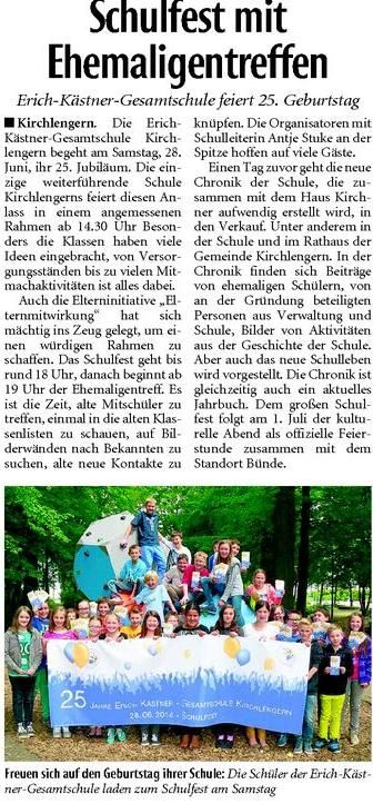Kirchlengern. Die Erich Kästner-Gesamtschule Kirchlengern begeht am Samstag, 28. Juni, ihr 25. Jubiläum. Die einzige weiterführende Schule Kirchlengerns feiert diesen Anlass in einem angemessenen Rahmen ab 14.30 Uhr Besonders die Klassen haben viele Ideen eingebracht, von Versorgungsständen bis zu vielen Mitmachaktivitäten ist alles dabei.